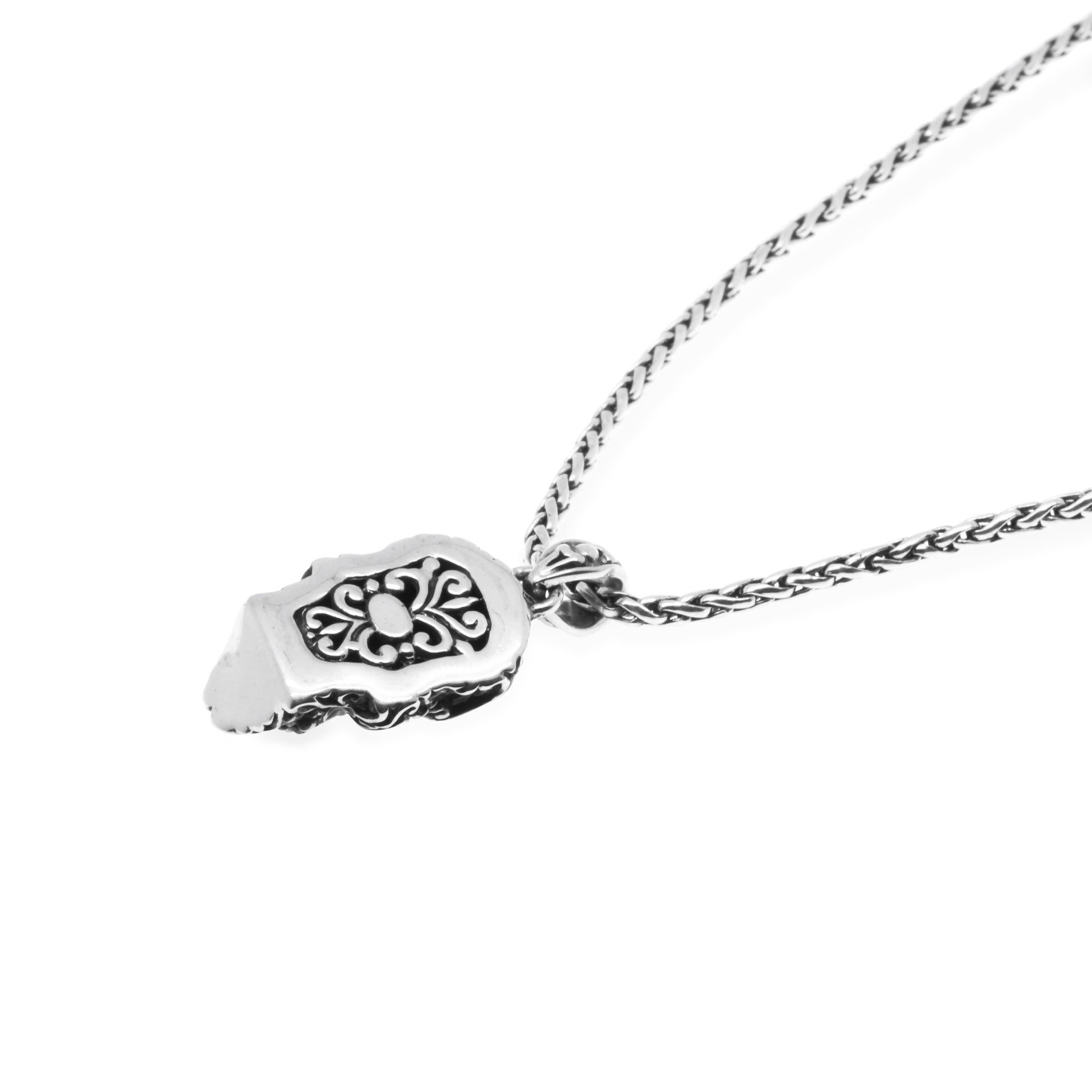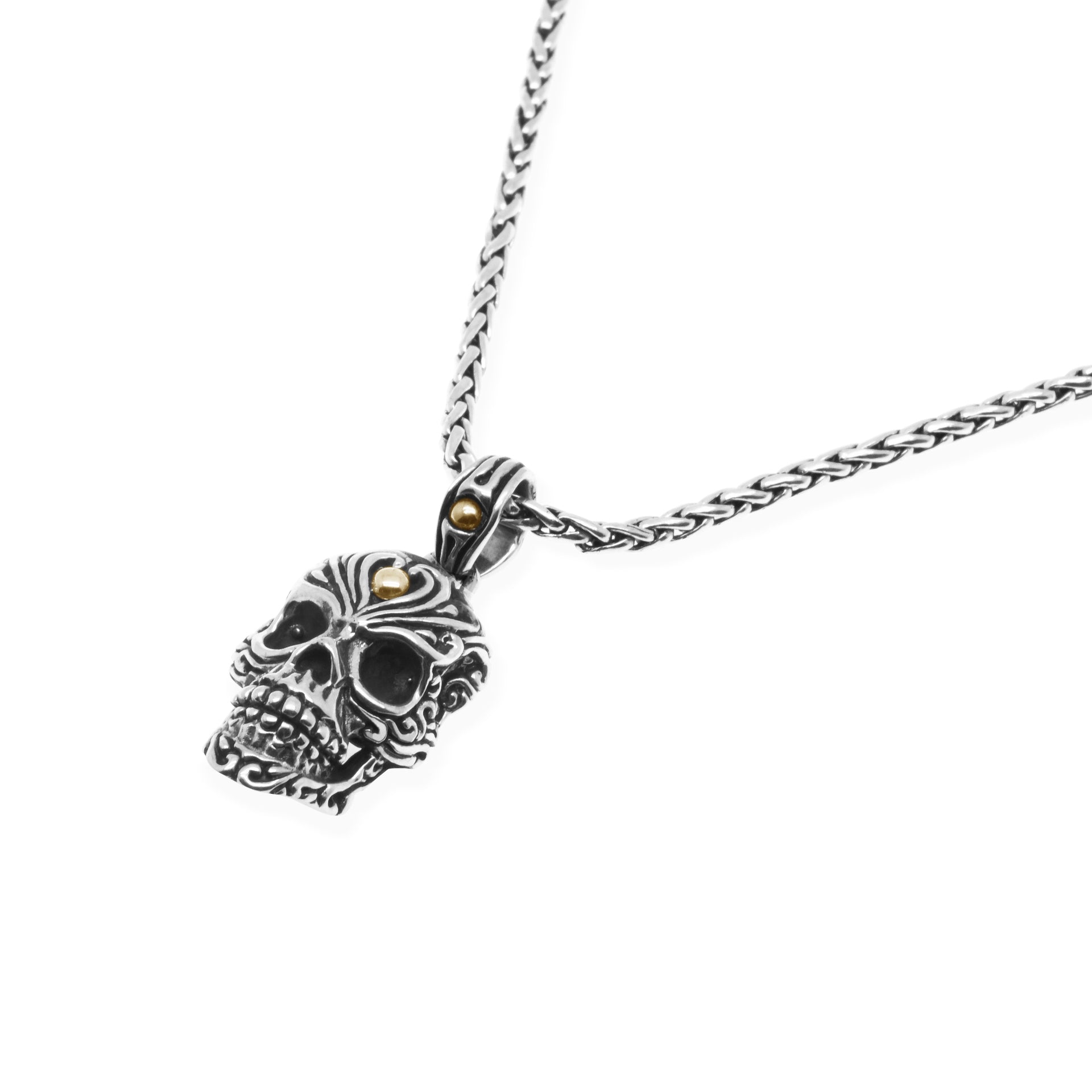 With a skull motif as its primary design and decorated with the Balinese ethnic carving style, this product is intended for men who want to express their strong personality through Jewelry. Crafted in Sterling Silver and 18k Gold, this collection represents toughness, strength, and luxury. This collection perfectly matches your daily style.